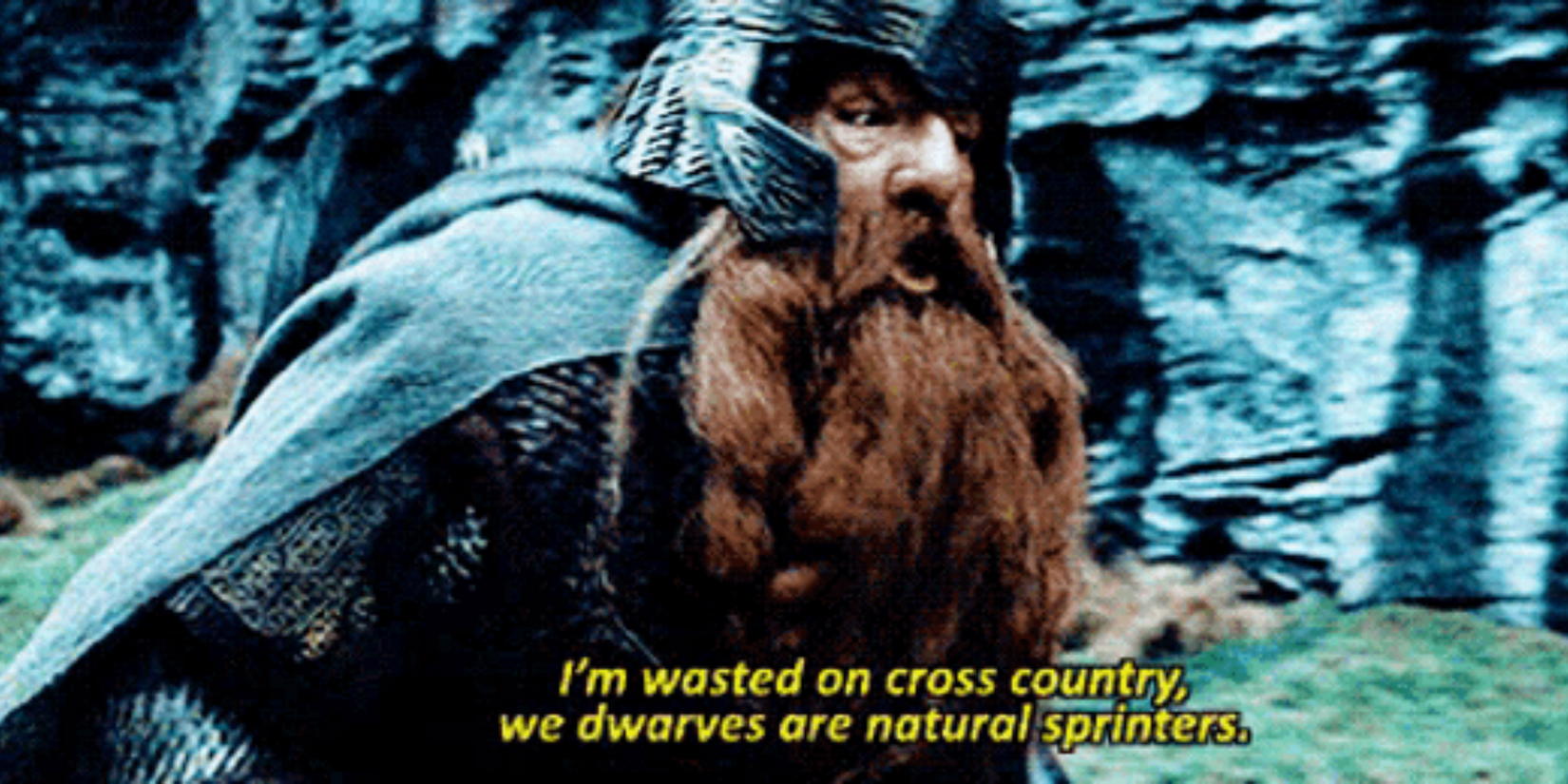 Gimli says something surprising when he talks about being “wasted on cross country” and claims dwarves are naturally fast runners. The way he puts it sounds strangely contemporary, almost like Middle-earth has its own version of track and field or school sports.