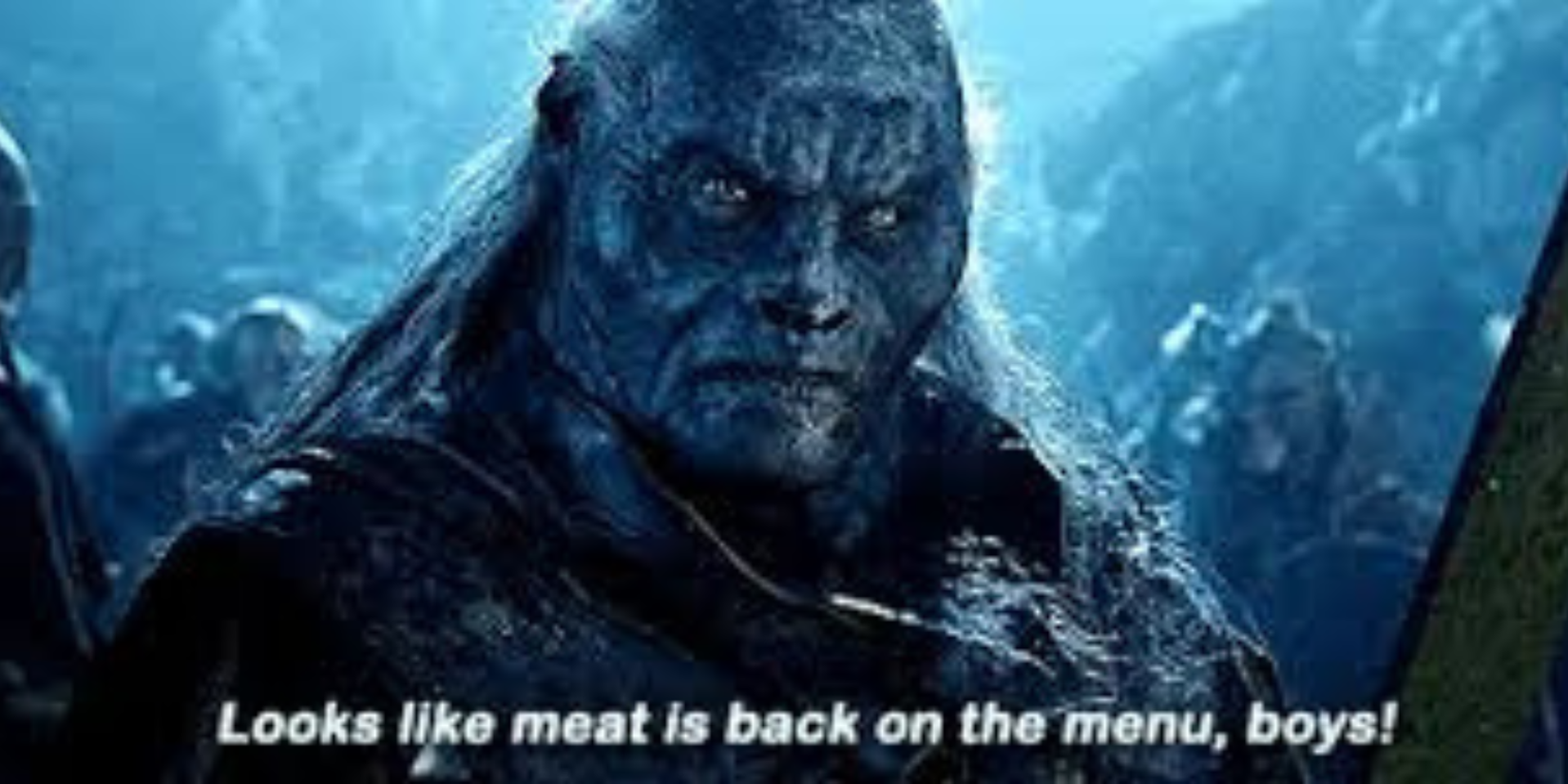 In The Two Towers, when the Uruk-hai gleefully declare “meat is back on the menu,” it’s a surprisingly humorous moment that also hints at their strange culture. The line is both funny and a little scary, and it sounds remarkably contemporary for a world of swords, torches, and basic battlefield food.