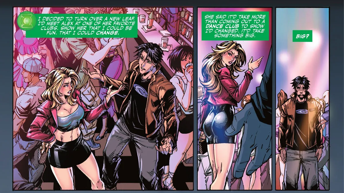 Kyle attempts to win Alex over by surprising her at the club she loves, but she’s not convinced he’s truly different. Despite this setback, the night unexpectedly changes Kyle’s life. While stepping outside for some air, he’s chosen as the new bearer of a Green Lantern ring.