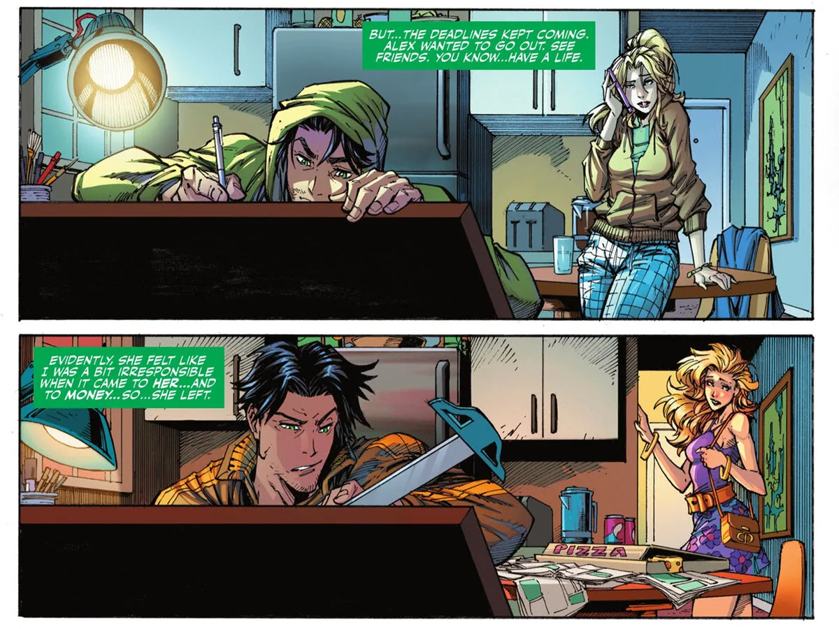 Kyle reminisces about his first love, Alexandra, known as Alex DeWitt. He explains how drawing Alex inspired him to become a comic book artist and ultimately helped him land his first job. However, their relationship ended because Kyle’s low income and dedication to his work kept him home, and Alex felt unsupported and neglected. Eventually, she broke up with him due to these issues.