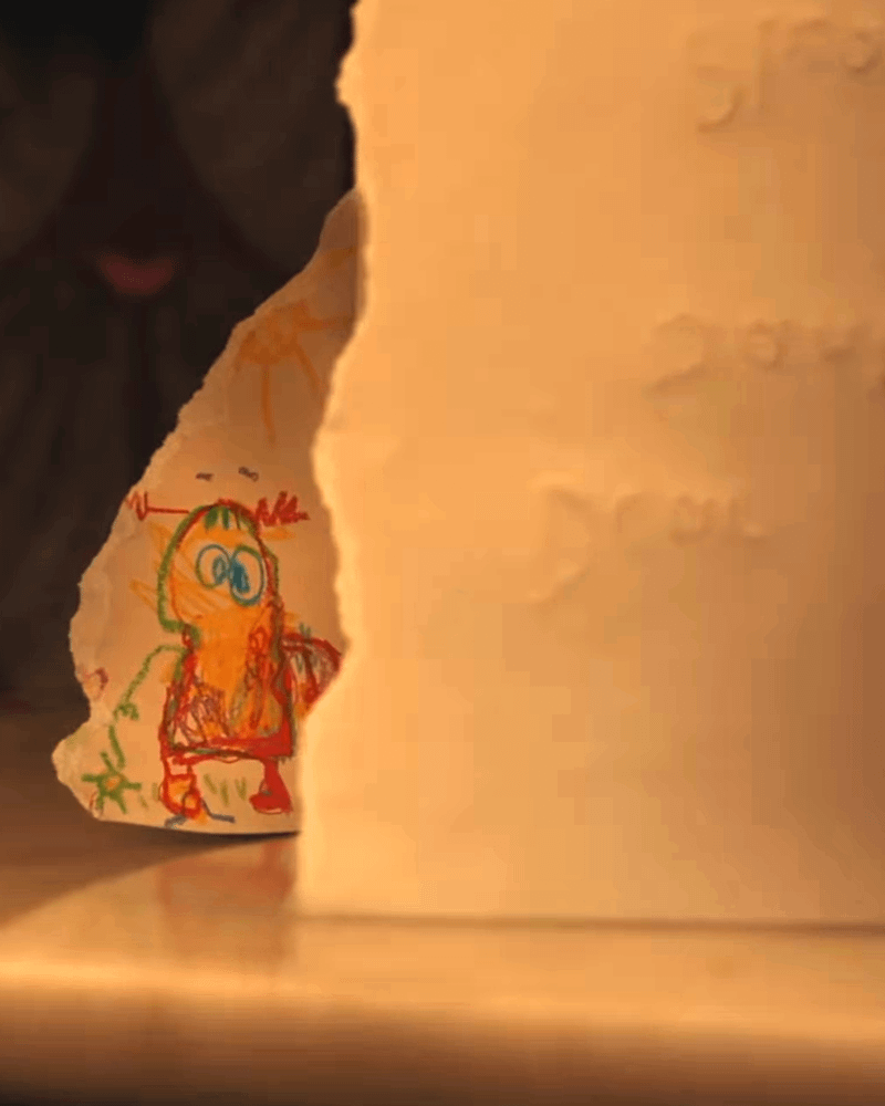 The letter to Santa is pictured ripped open, and next to it is a drawing that comes to life in the animated short.