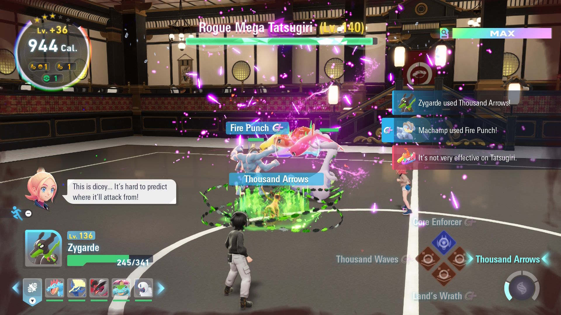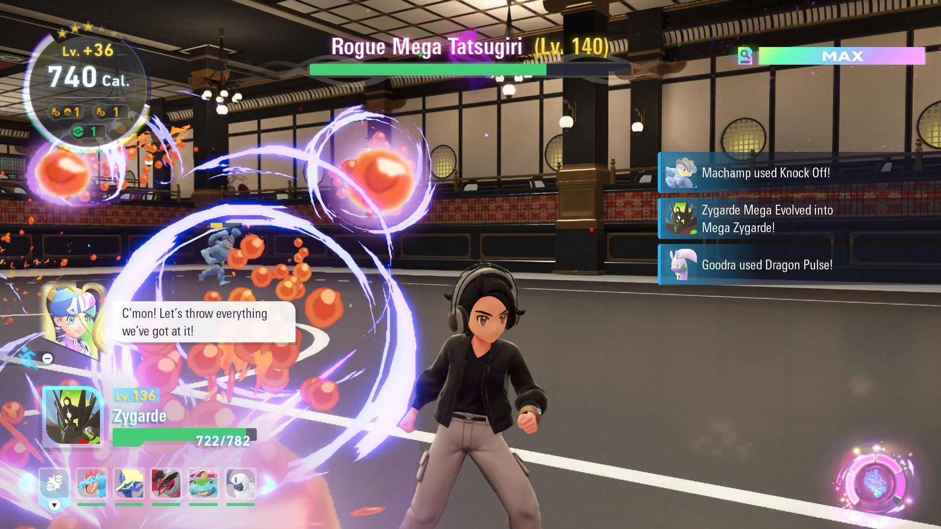 Even though you’re at level 140 in the story, you’ll now have access to better butter. This butter can significantly increase your Pokémon’s levels while they’re traveling through Hyperspace portals. I used it to boost my level 100 Pokémon to level 136 – enough to challenge this powerful Rogue Mega Evolution. As usual for these tough boss fights, your NPC teammates will also be there to help.
