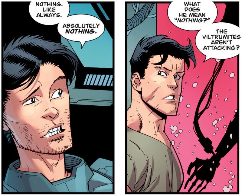 Throughout this story arc, Mark Grayson and Zack Thompson share a striking resemblance, as seen in the panels above – Tech Jacket essentially looks like a thinner, less polished version of Invincible. This similarity is highlighted even when Mark is unconscious after his fight with Conquest, as he grows a beard while in a coma, mirroring Zack’s appearance.