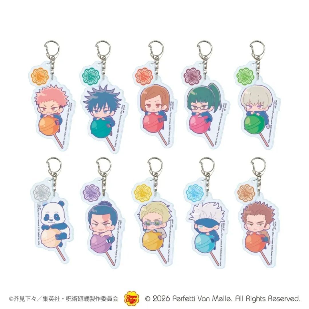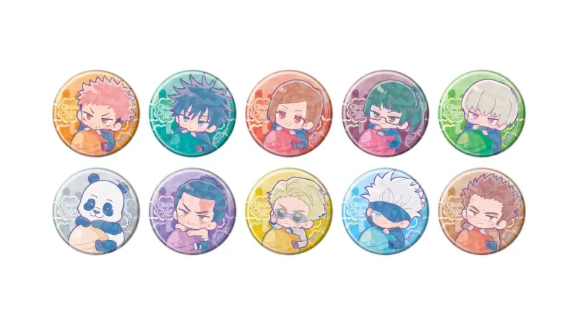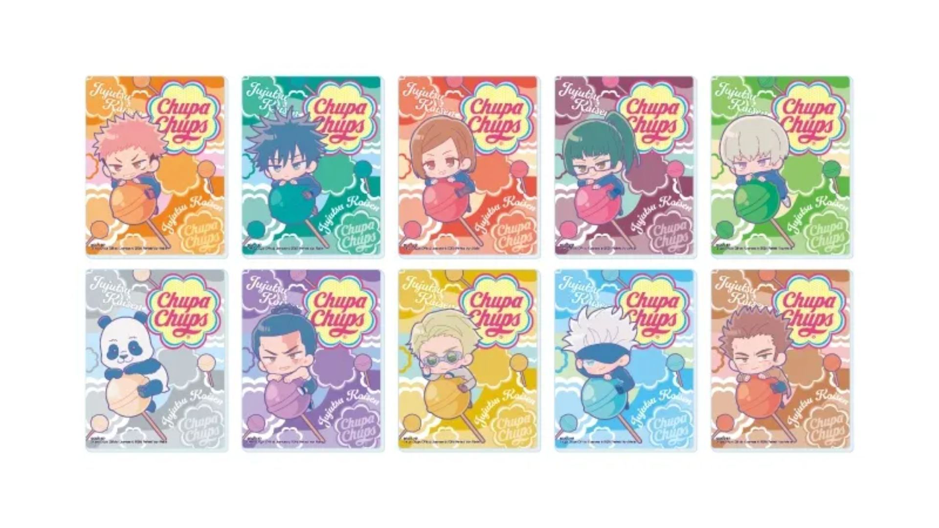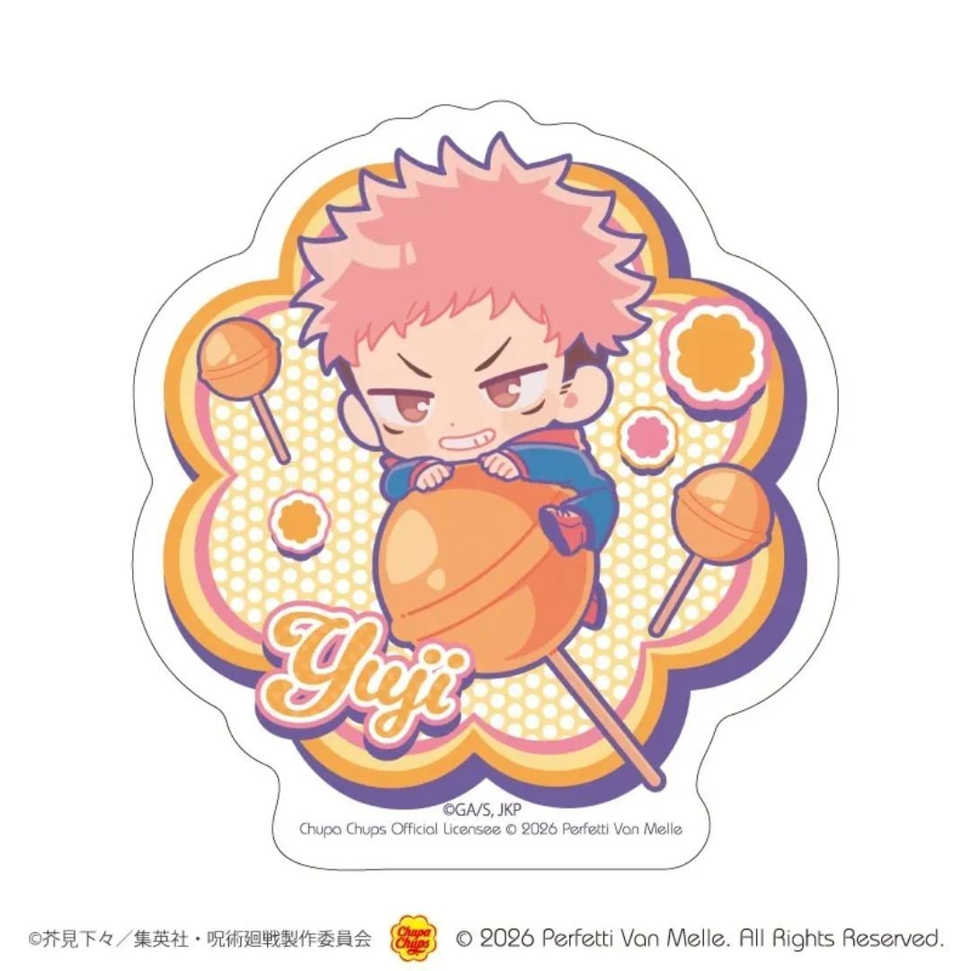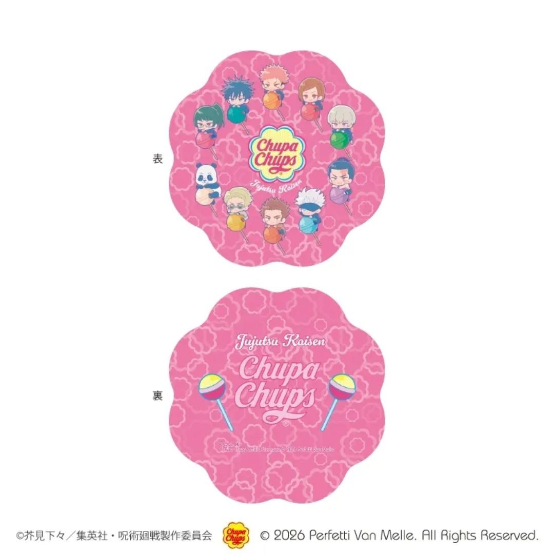 I’m so excited – Chupa Chups and Jujutsu Kaisen are teaming up! It’s such a fun mix – those bright, sweet lollipops are entering the world of this awesome anime. And get this: all my favorite characters – Yuji, Megumi, Nobara, Maki, Toge, Panda, Todo, and even Nanami – have been turned into the cutest little chibi versions you’ve ever seen! They’re all riding around on giant Chupa Chups lollipops – it’s seriously adorable and a perfect way to bring a little sweetness to the series.