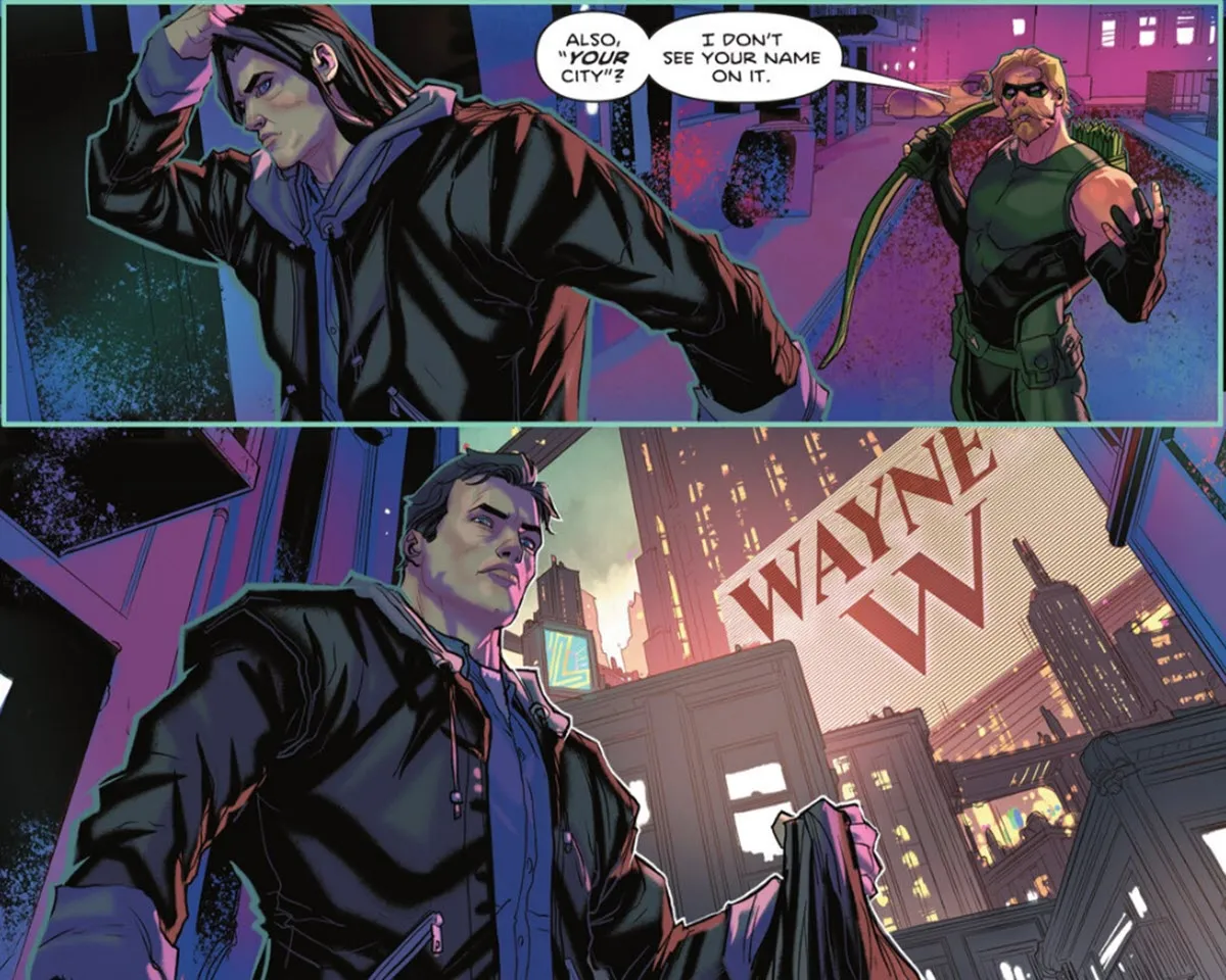 Detective Comics #1107, written by Tom Taylor and illustrated by Pete Woods, begins with a conflict – but it’s not the usual gang warfare in Gotham. This time, Batman is clashing with Green Arrow, who has recently relocated to the city with Black Canary and is now operating as a vigilante.