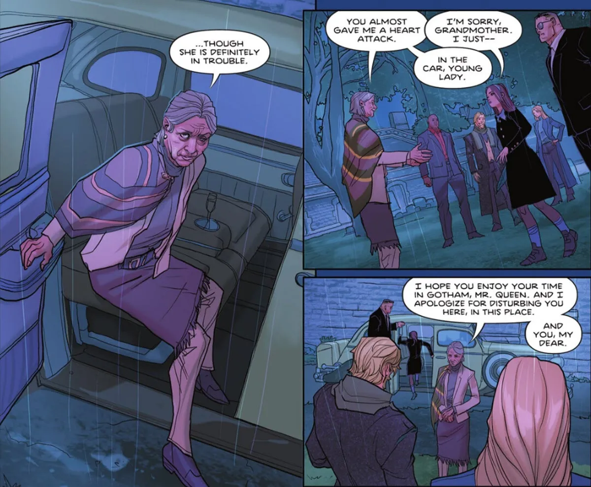 Their quiet watch was broken when a young girl arrived, causing Batman to vanish. She said she’d known Prion, but wasn’t sure if he was a smiley person. Before they could find out who she was, an older woman, claiming to be her grandmother, arrived and took her away. The grandmother recognized Oliver Queen, wishing him well during his stay in Gotham. She also appeared to disapprove of Prion as she looked at his grave.