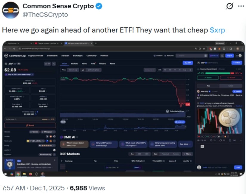 Несмотря на активность, связанную с ETF, краткосрочная волатильность остается повышенной. 1 декабря XRP снизился более чем на 5%, до примерно $2.08. Один из комментаторов крипторынка в X предположил, что это падение может отражать краткосрочное позиционирование перед запуском TOXR ETF. Некоторые в сообществе предположили, что такие движения напоминают предыдущие закономерности перед крупными регуляторными или продуктовыми событиями; однако корреляция не подразумевает намеренного манипулирования рынком. 🤔 “Рынок — волшебник, всегда прячущий мяч.” 🎩