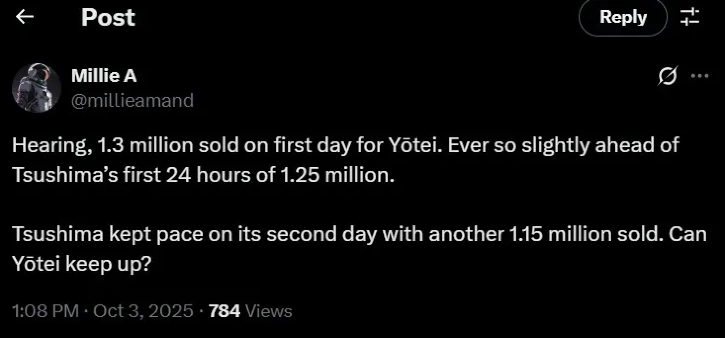 On October 3, 2025, a user named Millie A (@millieamand) on X (formerly Twitter) reported that the game Yōtei sold 1.3 million copies on its first day. This is slightly more than the 1.25 million copies sold by Ghost of Tsushima in its first 24 hours. Tsushima then sold another 1.15 million copies on its second day, and Millie A wondered if Yōtei would be able to maintain similar sales momentum.