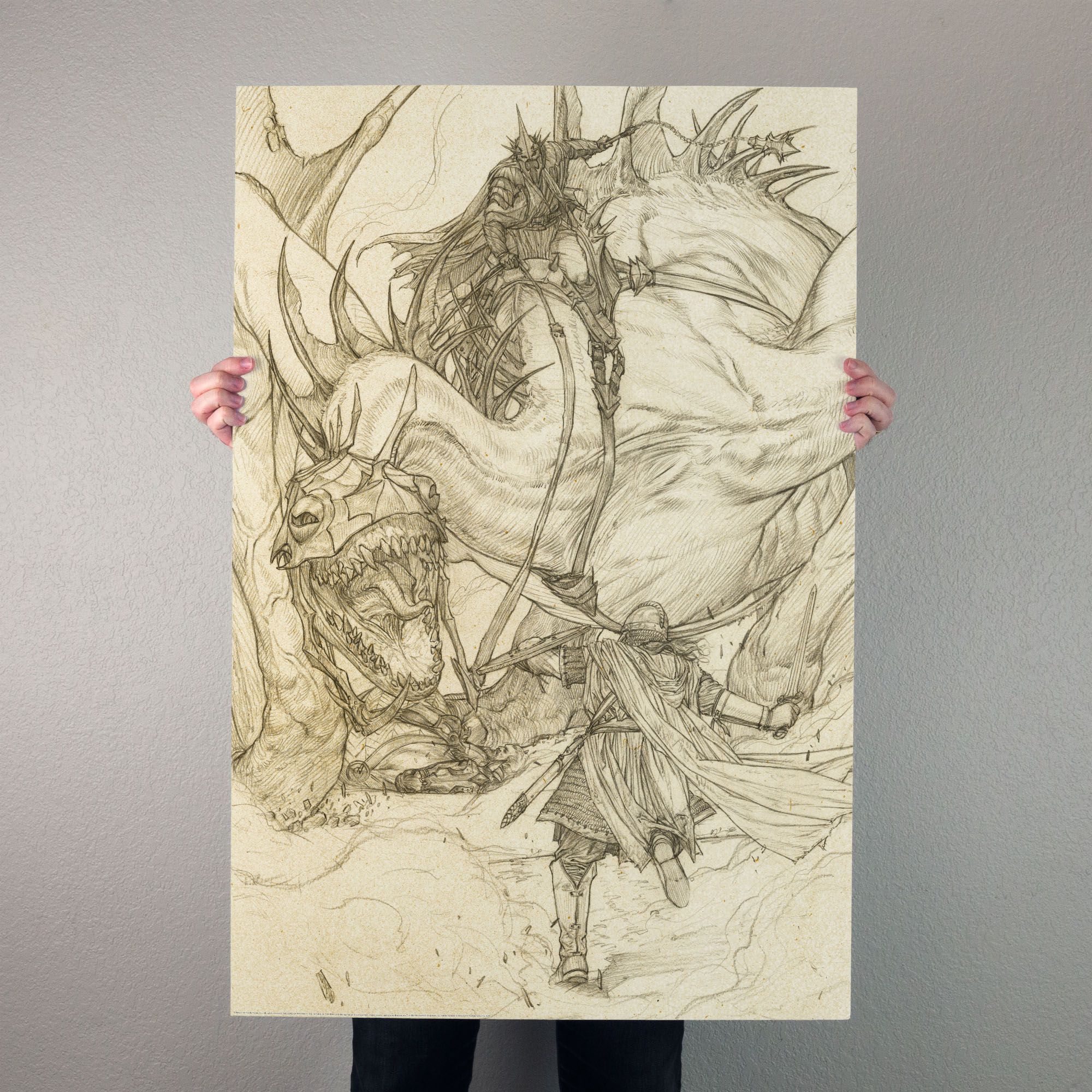 The poster for Mondo and Federici’s The Lord of the Rings: The Fellowship of the Ring depicts a scene from the movie’s opening. It shows the final moments of the War of the Last Alliance, right before Isildur cuts the One Ring from Sauron’s hand.