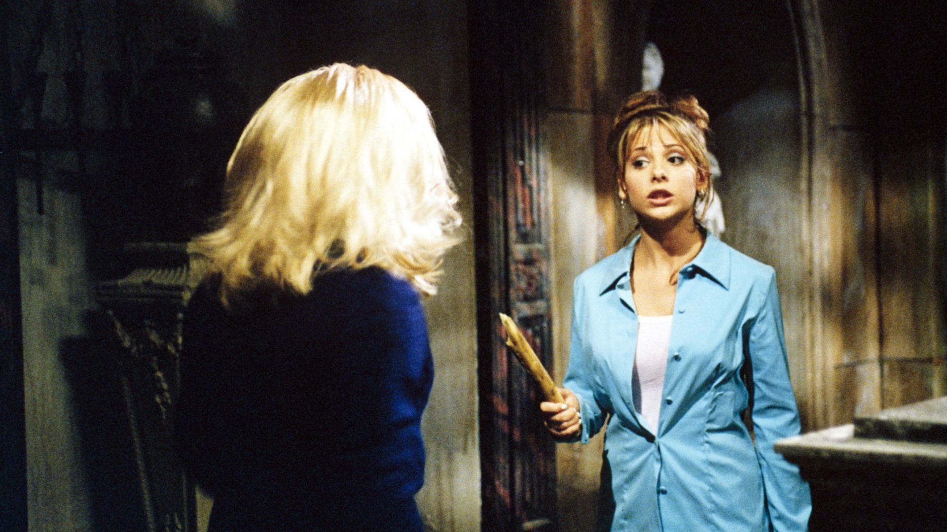 The actress was talking about a memorable outfit from the first episode of Buffy the Vampire Slayer. Sarah Michelle Gellar wore a white t-shirt layered under a partially open blue shirt, and her hair was pulled back in an updo.