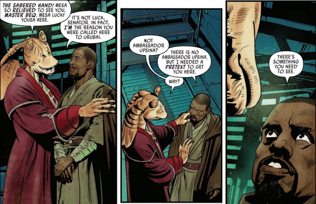 The Star Wars comic, Jar Jar #1, takes place between Episodes II and III. It begins with Senator Jar Jar Binks receiving a summons to the faraway planet of Urubai. He believes the request came from an ambassador named Upsina, but it was actually Kelleran Beq who contacted him. Beq used the name Upsina to keep his communication discreet and avoid unwanted attention.