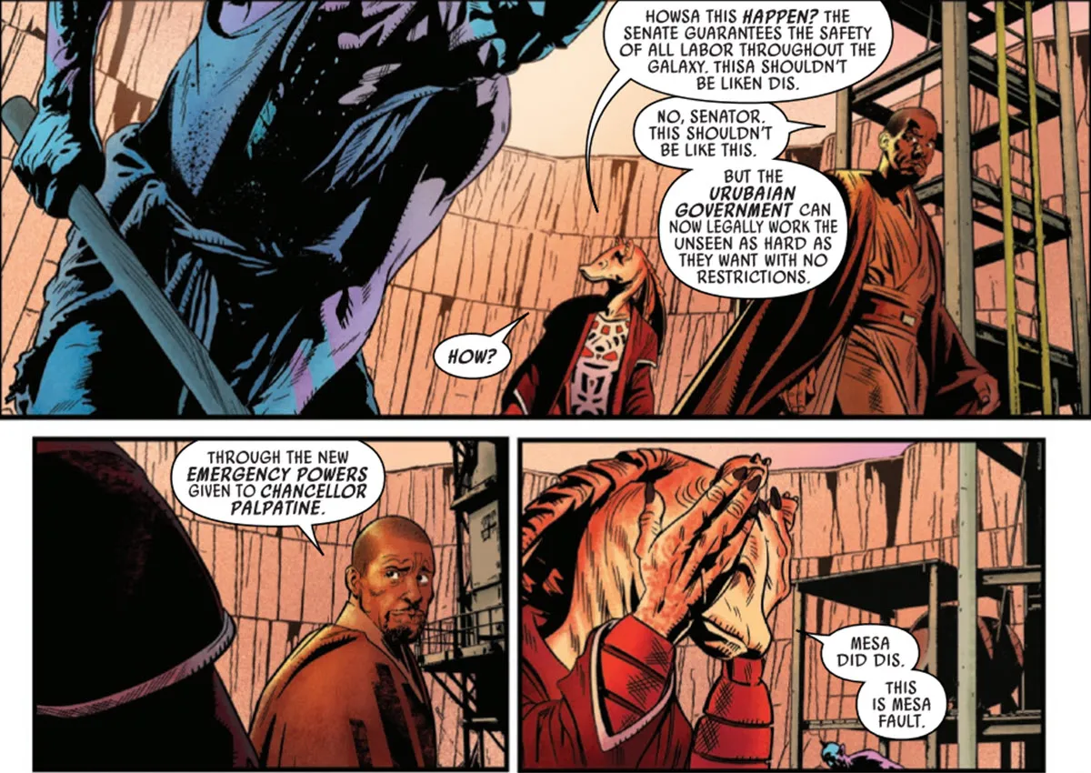 Beq discovers that Urubai isn’t the peaceful paradise it pretends to be. Most of the planet is actually dedicated to mining, and the workers – known as the Unseen because they’re kept hidden – are treated like slaves. Jar Jar is stunned by the terrible working conditions, but he’s even more horrified to realize these conditions are a direct result of the emergency powers he previously helped Chancellor Palpatine obtain.