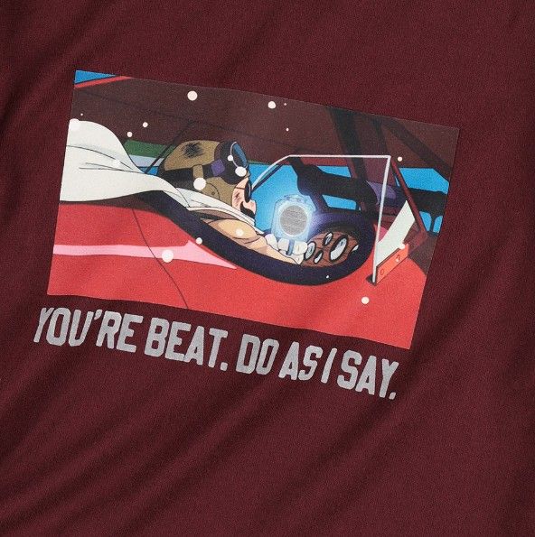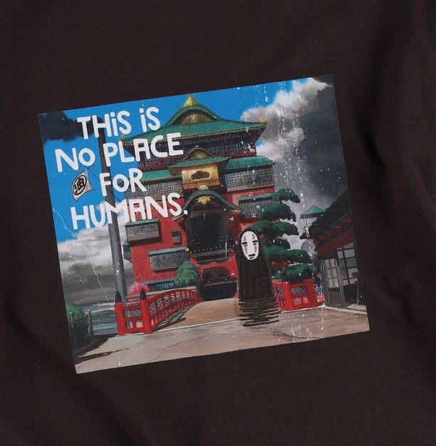 The design also celebrates a funny scene from Howl’s Moving Castle (2004). In the movie, Howl gets very upset when his hair is dyed the wrong color. He becomes so gloomy that he literally starts to melt! Sophie and Markl try to help by pushing his chair around. The T-shirt shows Sophie, as an old woman, and Markl working together to move Howl’s chair.