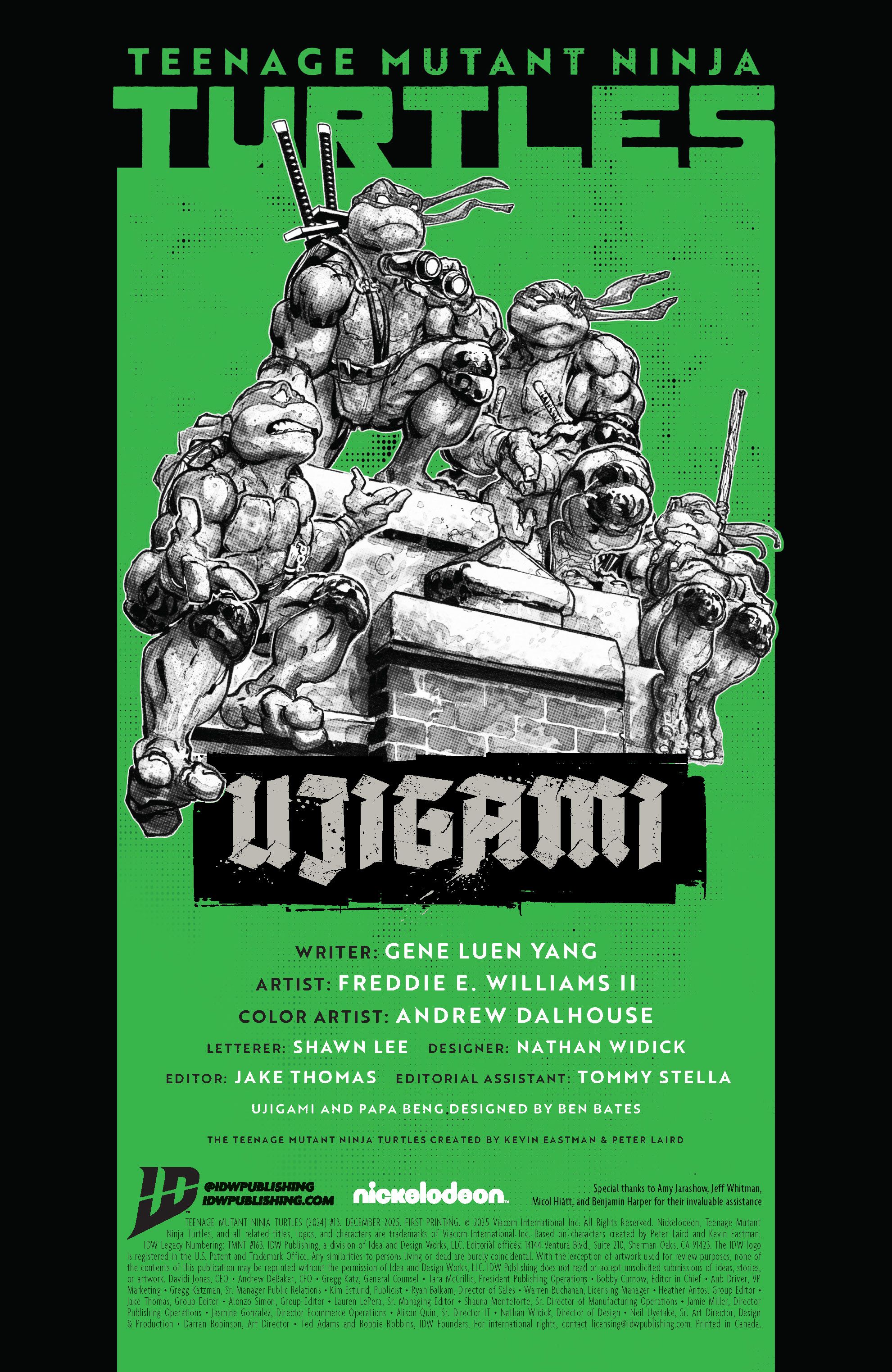 Get ready for a fresh start with the Teenage Mutant Ninja Turtles! Award-winning writer Gene Luen Yang (known for works like American Born Chinese and Avatar: The Last Airbender) is now writing the adventures of the Turtles! After the dramatic events in issue #12, the Turtles find themselves in a New York City that sees them as heroes. But their celebration won’t last long, as new villains emerge to challenge them. Papa Beng, a mutant yak, is trying to expand his gang’s influence, unaware that a dangerous new assassin named Ujigami is watching him and other TMNT enemies!