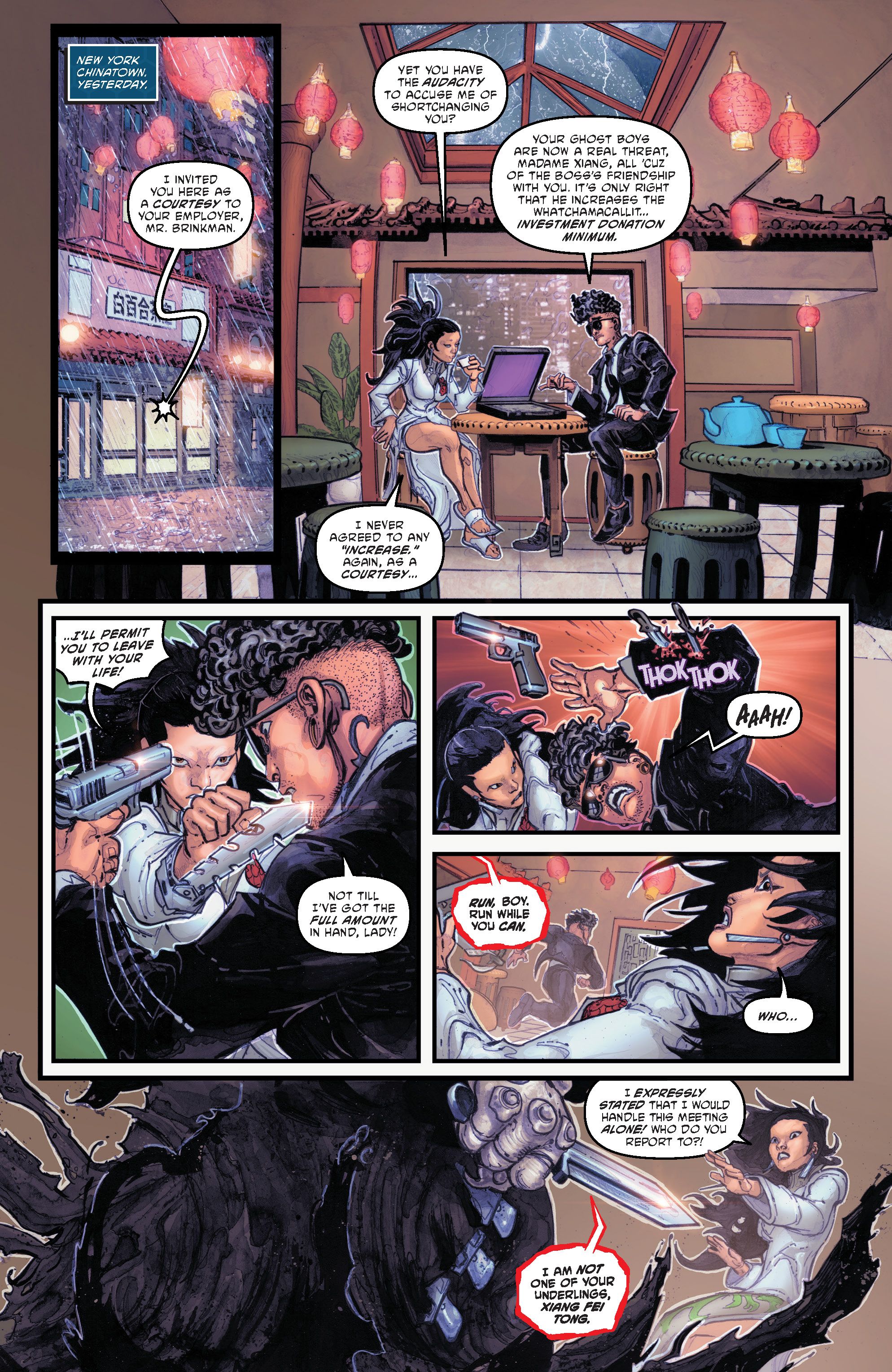 The story begins with a strange man meeting the leader of a local Triad. He’s there to revisit an agreement she previously made with his secretive employer. A tense confrontation happens, but it’s cut short by the arrival of a new enemy named Ujigami. Ujigami seems to have powers similar to the Turtles, or possibly he’s a demon. He allows the mysterious man to escape, but then brutally kills the Triad leader.