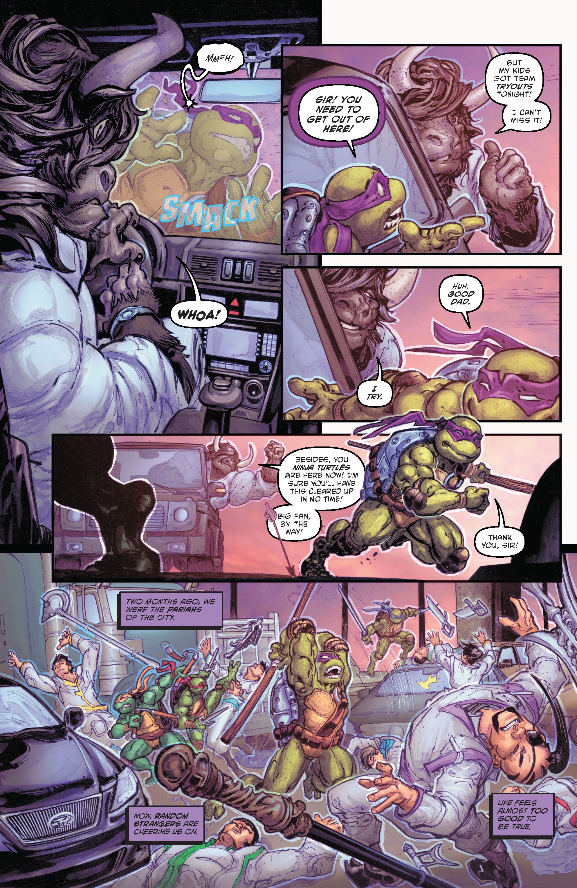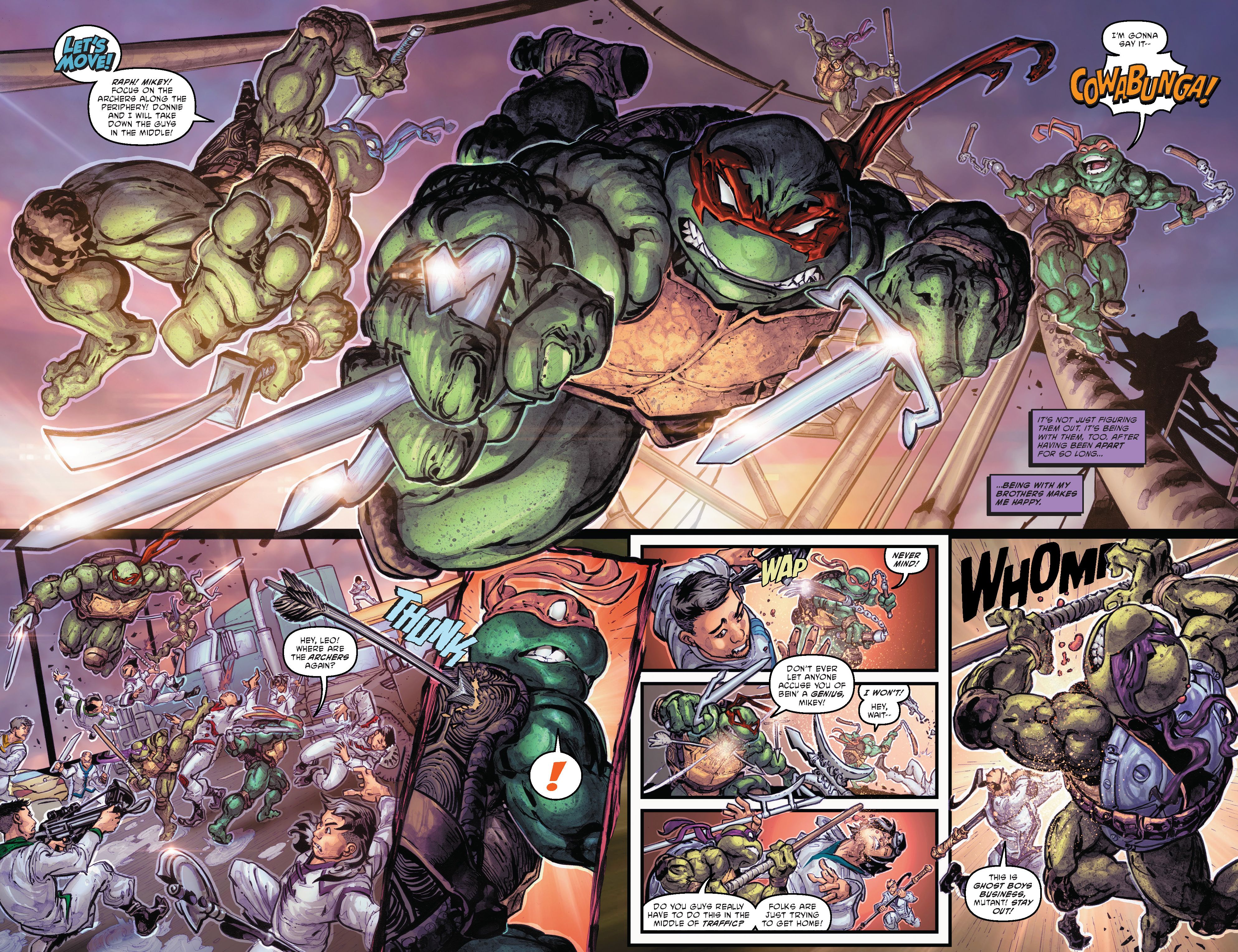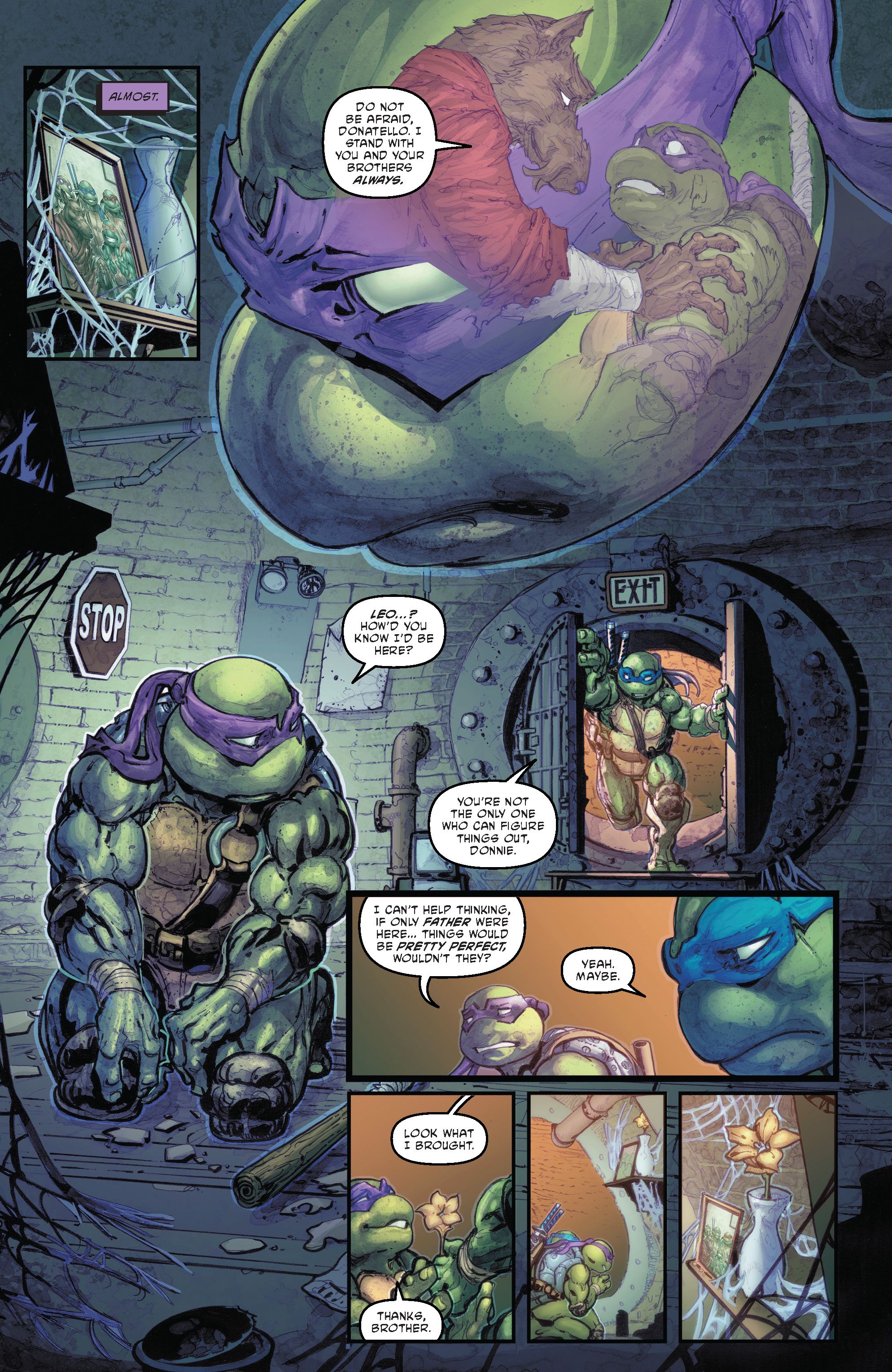 While battling, Leonardo remembers how much Donatello is hurting after Master Splinter’s disappearance. Unbeknownst to the Turtles, Splinter is actually still alive, having been brought back in the last issue written by Aaron.