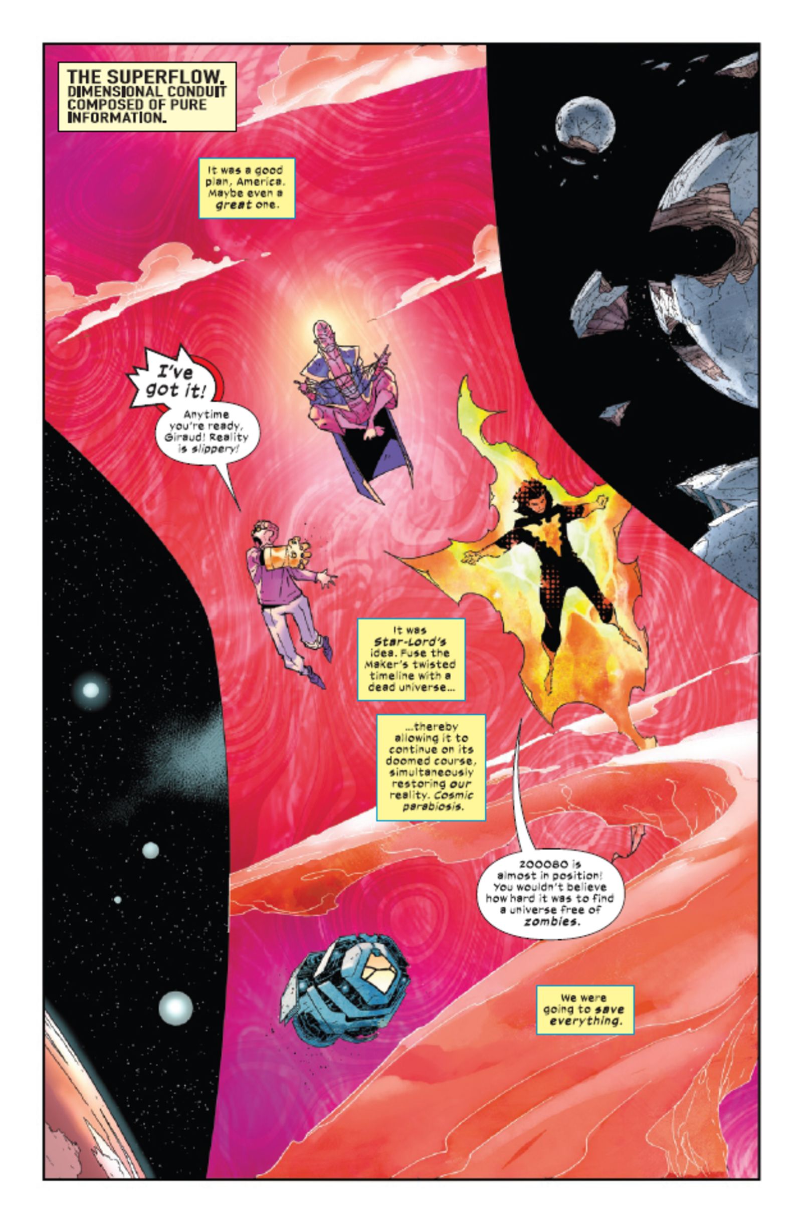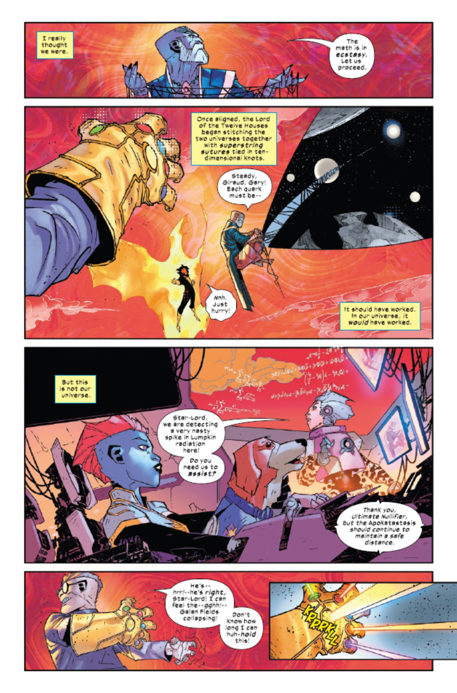 A preview of Marvel’s Ultimate Universe: Two Years In #1 (from creators Deniz Camp, Alex Paknadel, and others) shows the future Guardians of the Galaxy unable to prevent a disaster in their timeline. Luckily, there’s a massive force of tens of thousands of Guardians available to help, though their exact locations across space and time are completely unknown.