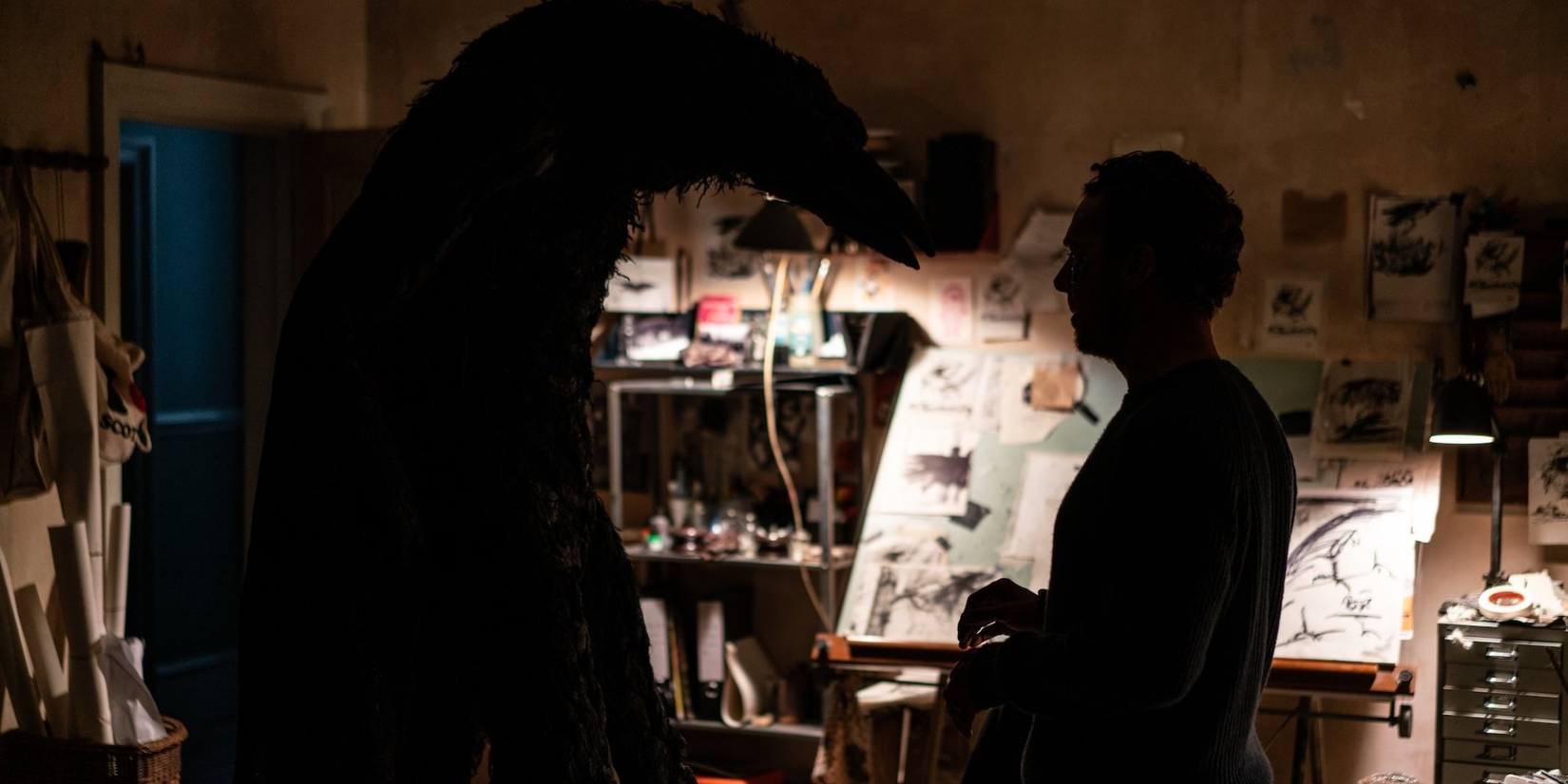 In under 100 minutes, The Thing With Feathers shows a man’s difficult process of adjusting to life after losing his wife. The film’s unsettling imagery – including dark, confined spaces, a frightening depiction of a crow, and dreamlike scene changes – powerfully reflects the disorientation and lack of stability that comes with grief. These effects are achieved through intimate, sometimes disturbing close-ups and distorted angles focusing on the father’s artwork.