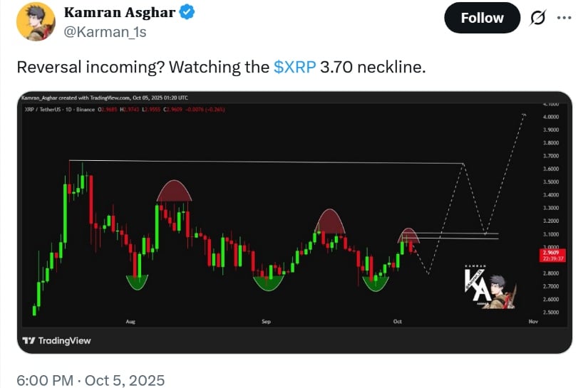 Встречайте Камрана Асгара, аналитика, который готов нарисовать нам картину *чрезвычайно* перспективного графика: он видит паттерн «голова и плечи» разворота на дневном графике XRP/USDT. Его цель? Захватывающий пробой на уровне $3.70. Если это произойдет? Возможно, нас ждет скачок в зону $4.00-$4.20. Держитесь крепче, люди. 🎩💥