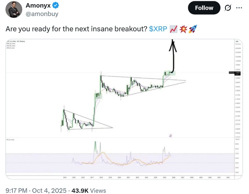 Крипто-трейдер @amonbuy поделился графиком, охватывающим период с 2013 по 2025 год, выделяя восходящий треугольник на отметке в $3. По сути, это как рынок посылает нам сообщение: ‘Это бычий паттерн!’ Но будьте осторожны, не все бросаются в омут с головой. Волатильное прошлое, включая драму с иском SEC, все еще нависает. Но эй, XRP уверенно держится выше $2.80, и это показывает, что спрос на него все еще есть. 🏆